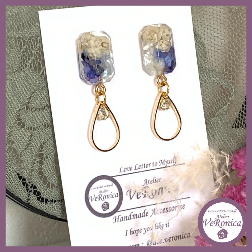 空色お花ピアス ハンドメイド レジン ブルー 花 ピアス イヤリング ステンレス シェル きらきら ゴールド 金具変更 アレルギー ベロニカ工房