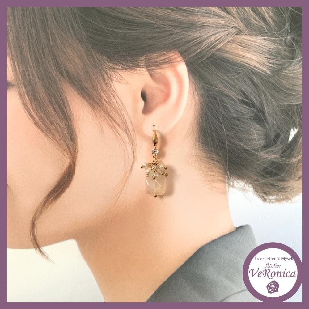 天然石ミルキークォーツのピアス ピアス フック ジルコニア 天然石 白 ゴールド おしゃれ レディース ベロニカ工房