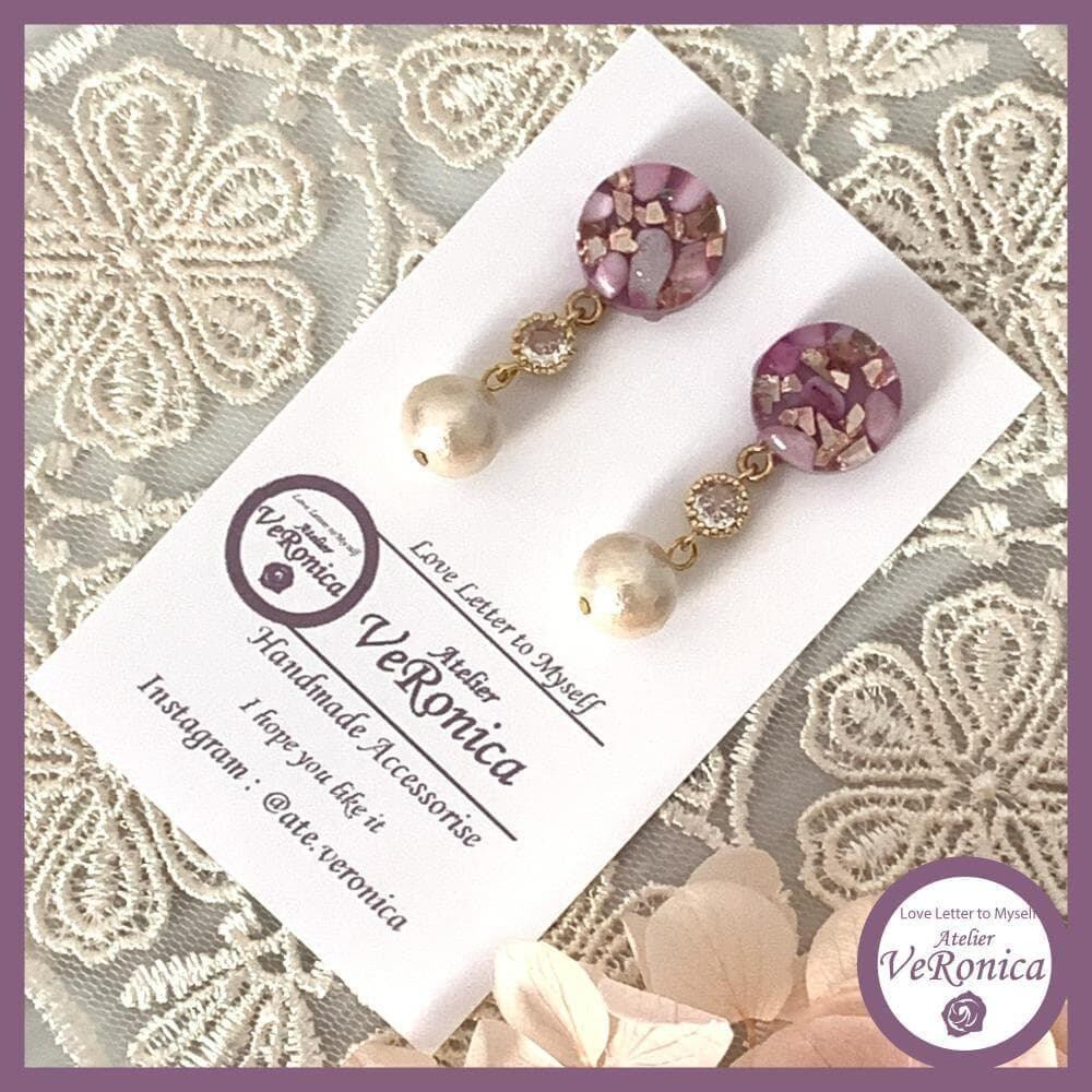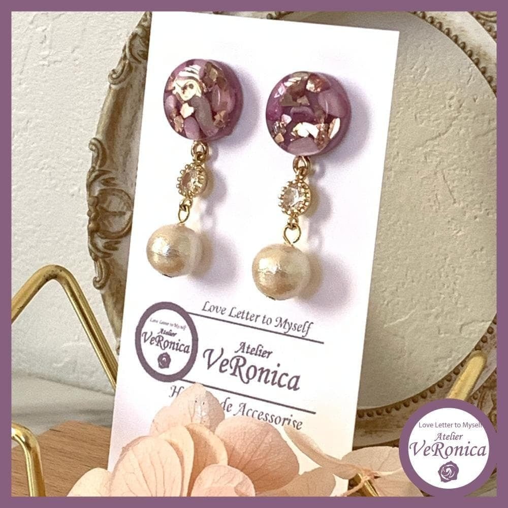 パープルレジンパールピアス ピアス レジン パープル シェル コットンパール ジルコニア 金具変更 アレルギー イヤリング おしゃれ かわいい ベロニカ工房