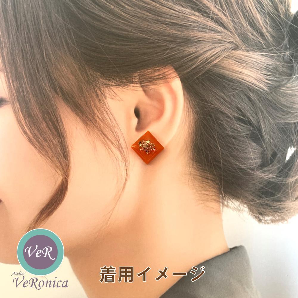 オレンジ3種ピアス ハンドメイド レジン イヤリング スクエア セット 四角