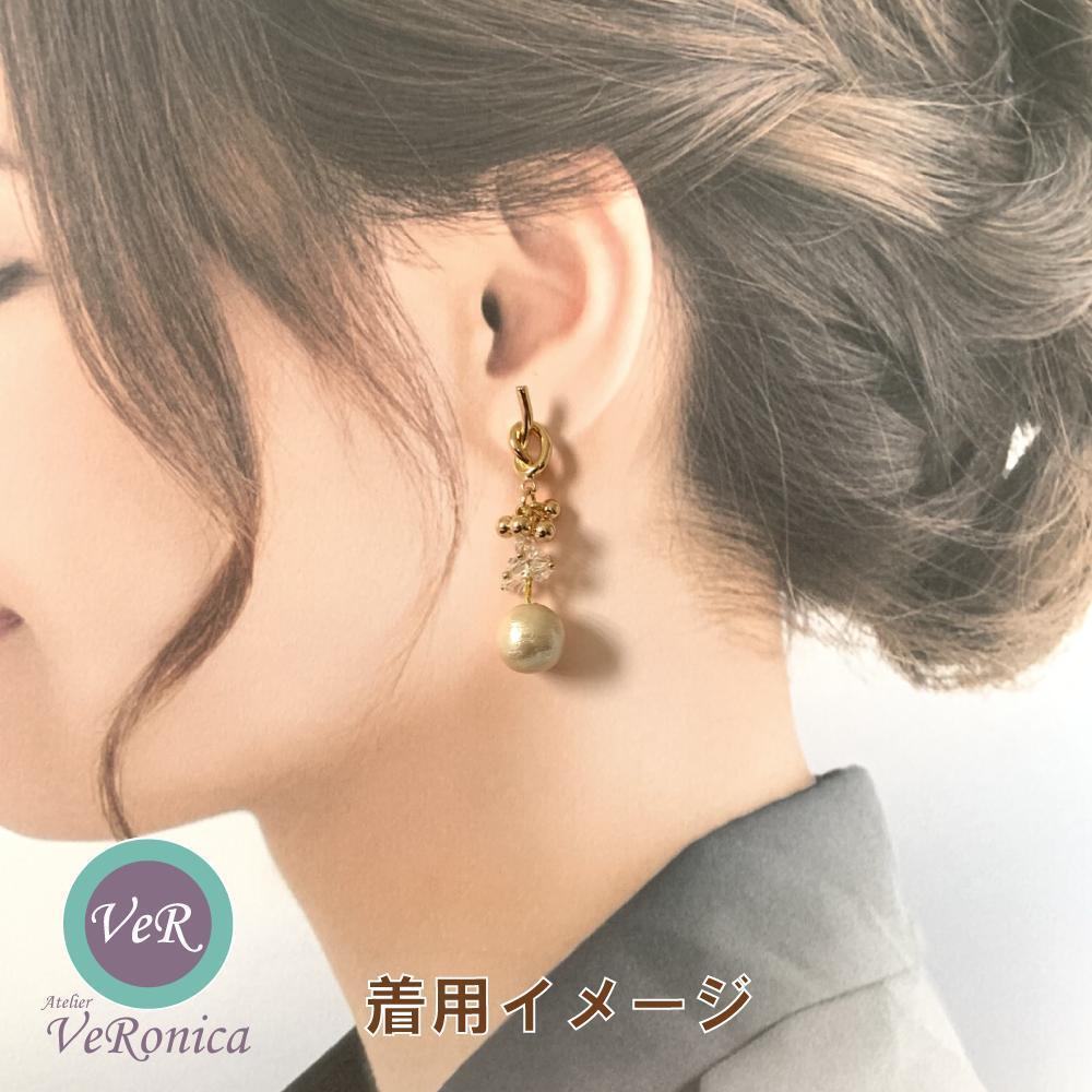 つぶつぶビーズと大ぶりなコットンパールが揺れるピアスです。