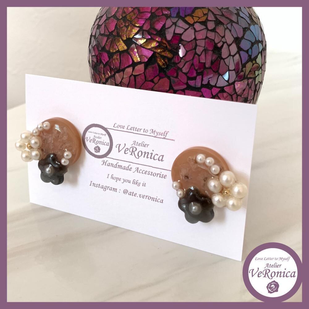 ベージュ★花柄ピアス ハンドメイド レジン 黒 パール ブラック アレルギー対応